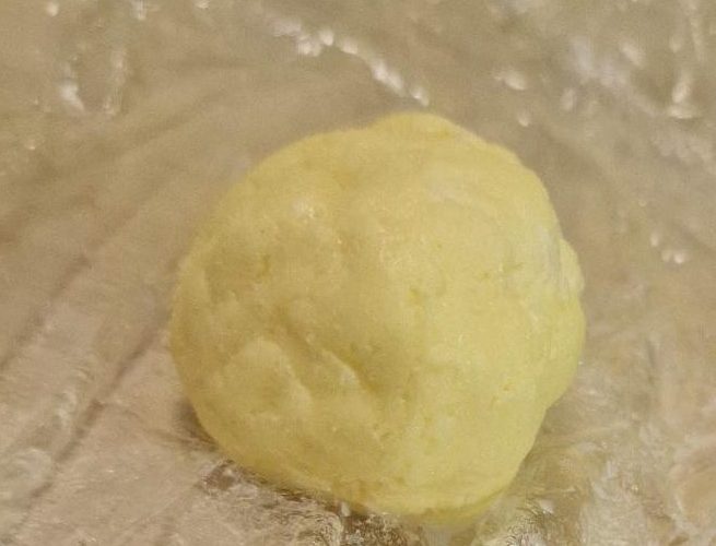 Jetzt knetest du den Teig mit der Hand durch bis er fest wird und glatt ist.